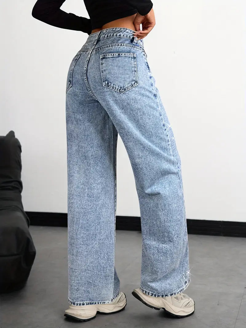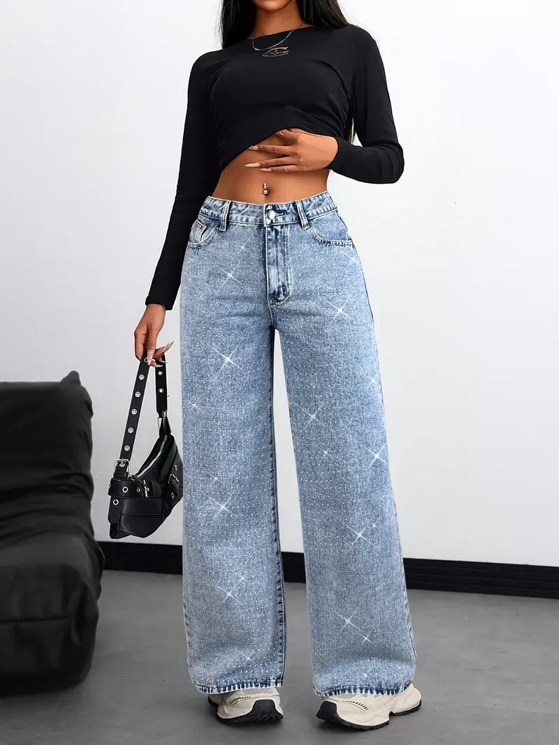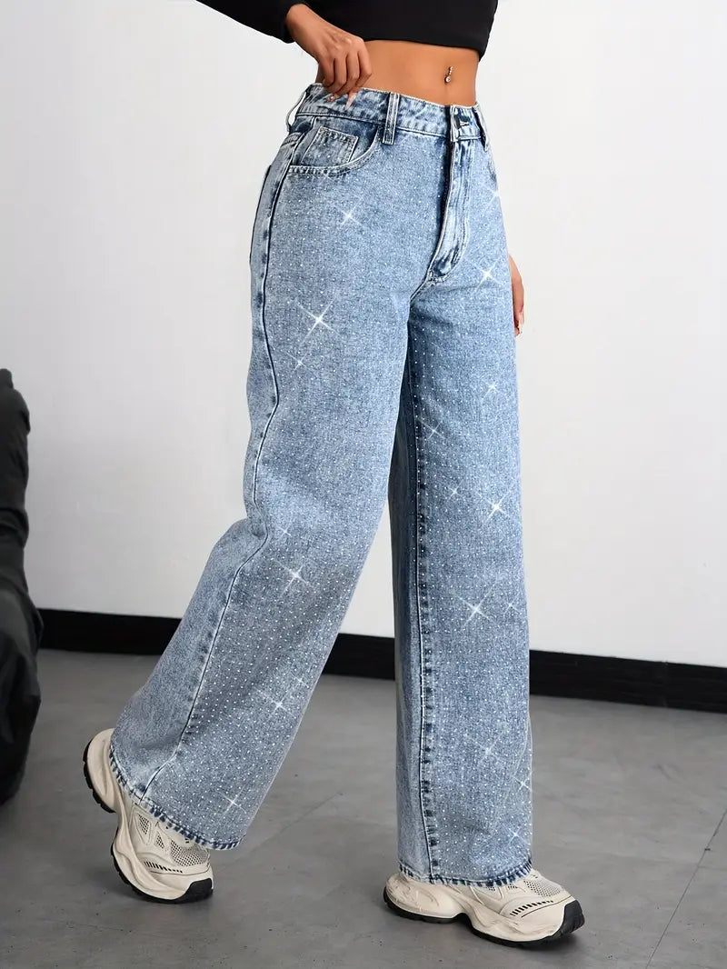 Бъди забележима с тези уникални широки дамски дънки със стилен бляскав ефект! Съчетавайки удобство и модерен дизайн, този модел е идеален за ежедневна визия. Широката кройка осигурява комфорт през целия ден, а декоративните блестящи елементи придават индивидуалност и шик.