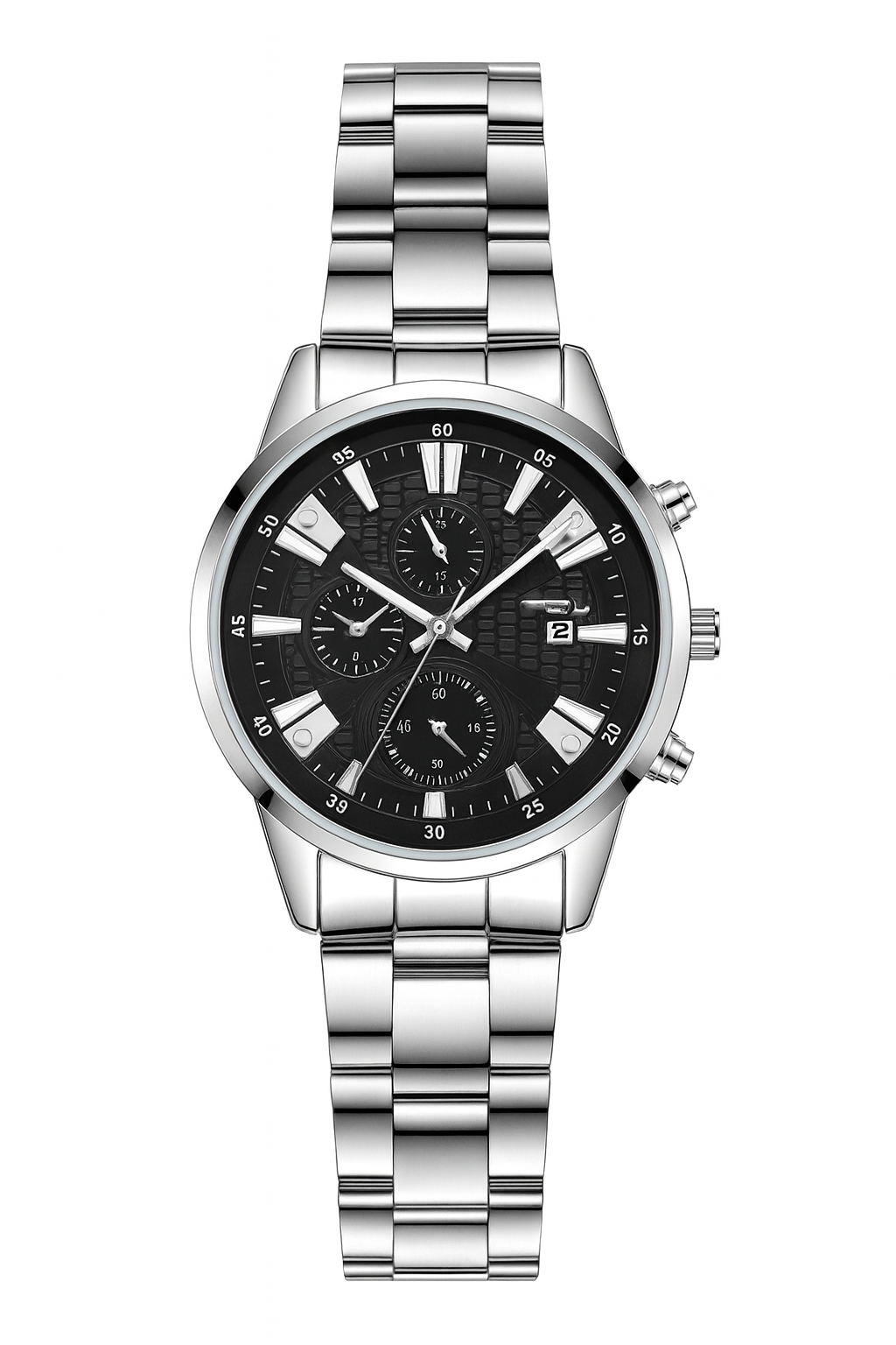 Елегантен и модерен мъжки часовник, съчетаващ стил и функционалност. Моделът разполага с изчистен черен циферблат с релефна текстура и три подциферблата за хронограф функции, които придават спортно-луксозно излъчване. Контрастните сребристи индекси и стрелки осигуряват отлична четимост, а вградената дата добавя практичност към дизайна.