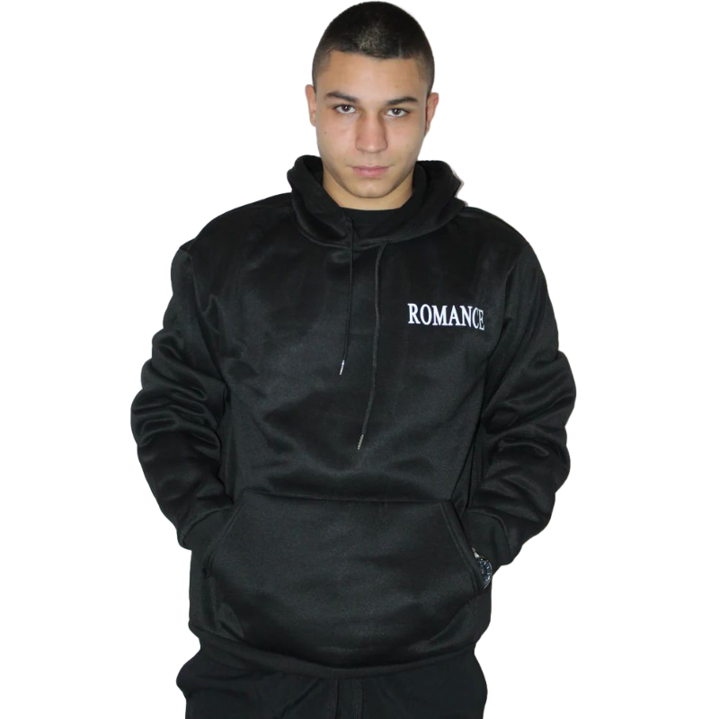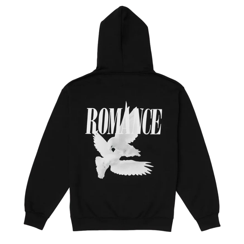 Черният фон подчертава изящния принт на две гълъби, символ на чистота, любов и вътрешен мир, докато bold надписът ROMANCE добавя характер и самоувереност.